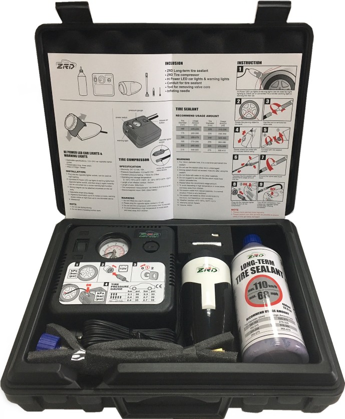 Item: JJT03 Product:【ZRD】Tire Care Kit Inclusion: - ZRD Long-term Tire Sealant - ZRD Tire compressor - Hi Power LED car lights & warning lights - Tools for removing valve core - Conduit for tire sealant - Inflating Needle |