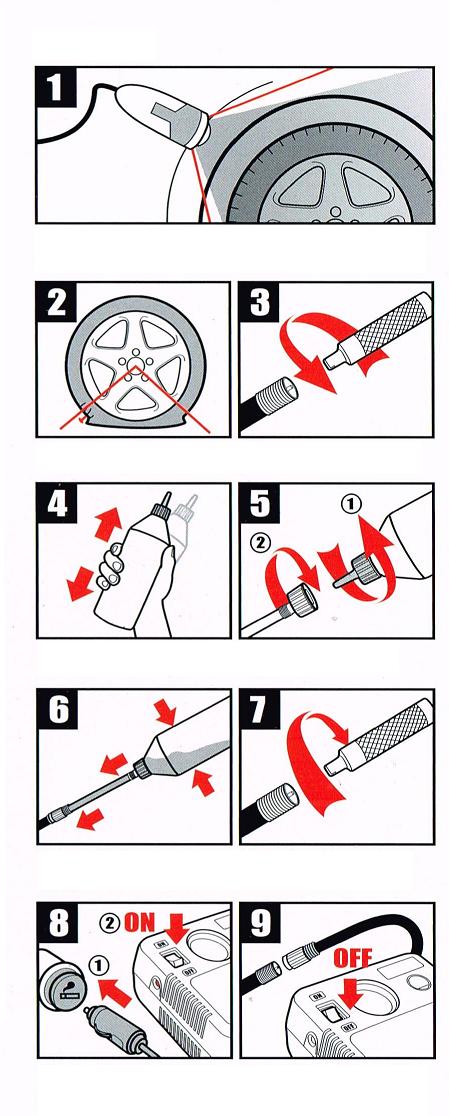1. Hi Power Led car lights & warning lights can be used as night lighting to check car or converted into a strobe warning light to warn the rear car. 2. Use the tool to remove the nozzle cork of tire. 3. Please shake the bottle with 2-3 minutes before using. 4. Replace with tire sealant conduit. 5. Connect with tire sealant conduit. 6. Ensure the nozzle cork is put back 7. Plug into the cigarette lighter socket to turn on tire compressor 8. Turn off tire compressor then unplug the cigarette lighter socket after inflating completed.